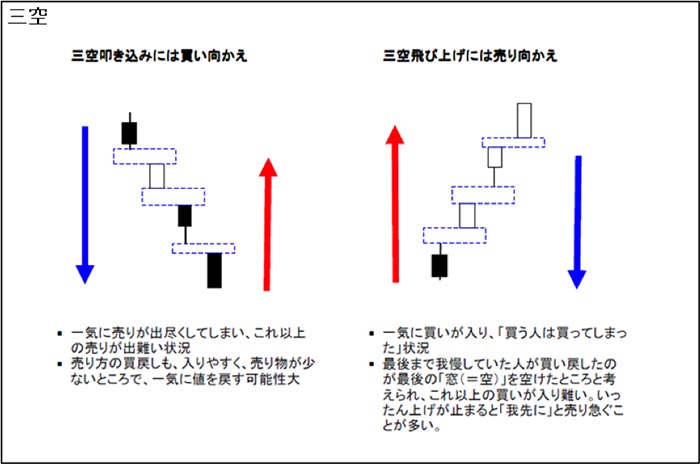 「三空」とは、連続して3回空(窓)を開けるもの。上げ相場においては「三空飛び上げに売り向かえ」と言って売りのシグナルとなり、下げ相場においては「三空叩き込みには買い向かえ」と言って(叩き込み=下げ相場の三度目の空の後を言い買い方の総投げ、売り方の売り崩しが起きる事が多い)大底を形成することが多いとされます。