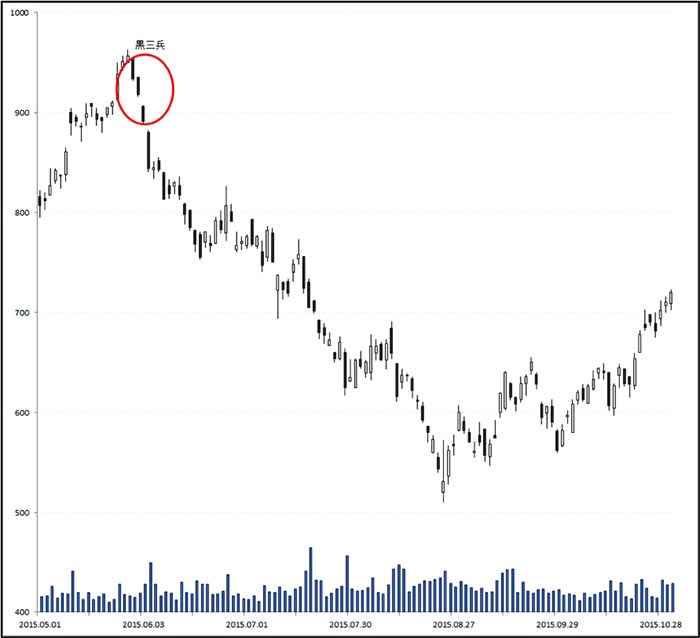 逆に上値を切り下げる格好で陰線が3本続いた形を「黒三兵」と言います。また「黒三兵」は「三羽烏」とも言われ、大幅下落の前兆とされます。烏は古来不吉な鳥というイメージが強く、陰線=黒=烏、と相場の下落が不吉なものとして、「三羽烏」は不吉の始まりとされています。