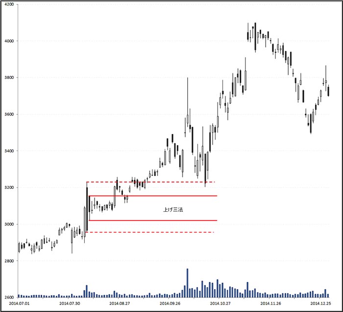下の図で示したパターンは、上昇過程において出現した大陽線のあと、小さな陽線・陰線をはらみ、大陽線の高値を坊主の陽線で抜けたもので、典型的な保ち合い相場を上に抜ける時の状況を表しています。