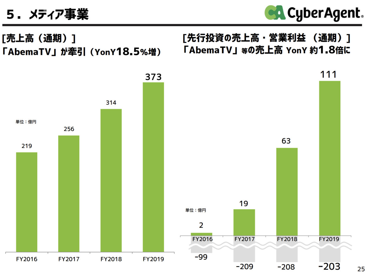 メディア事業の中で、AbemaTV等の先行投資事業の売上を見てみると、2019年度は約111億円と前年同期比で1.8倍というペースで成長しています。