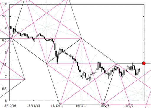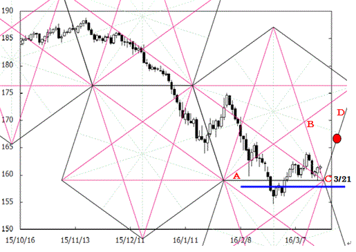 先週のレポートでは、BCラインに注目した。上値抵抗線BCラインを超えることが出来るのか否かがポイントになったからだ。実際には、BCライン沿って下落し、ACラインに到達。その後は160円を挟んでの動きが続いている。次の注目日は3月21日前後である。
