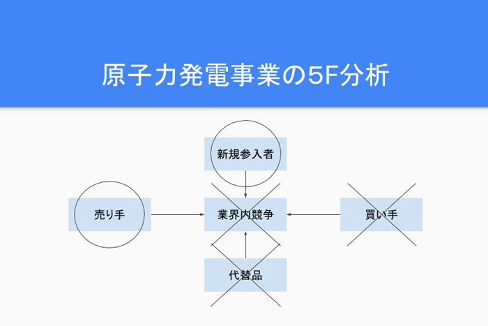 私は東芝の原子力発電事業は厳しい競争環境に置かれ、必ずしも魅力的な業界ではないと考えます。特に大きいのが買い手の力です。入札で競う業界では、最終的にコストギリギリまで下げた価格を出すことが多く、それは利益を出しにくい構造であることを意味します。