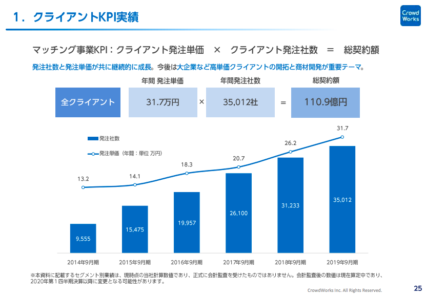 対して、クラウドワークスは1クライアントあたりの年間発注単価が31.7万円です。
