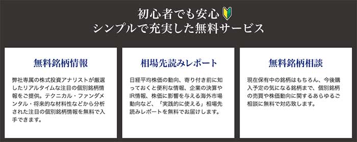メールアドレスを登録するだけで無料で情報が届き、また無料銘柄相談も行えるので、初心者から玄人まで自分にあった投資のヒントをもらえることが魅力です。さらに各種投資メディアで活躍中の藤井英敏氏・横山利香氏の「書き下ろし相場コラム」が読めることも人気の秘密となっています。