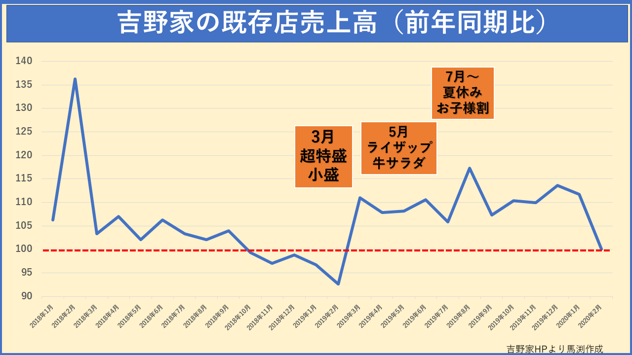 吉野家ホールディングスは牛丼事業の「吉野家」のほか、うどんの「はなまる」、持ち帰りすしの「京樽」と3つの大きな事業を展開。2019年2月期は60億円の赤字に転落したものの、今期は黒字転換を見越しています(編注:原稿執筆時点4月13日。14日に発表された2020年2月期連結決算では最終損益が7億円の黒字となっています)。