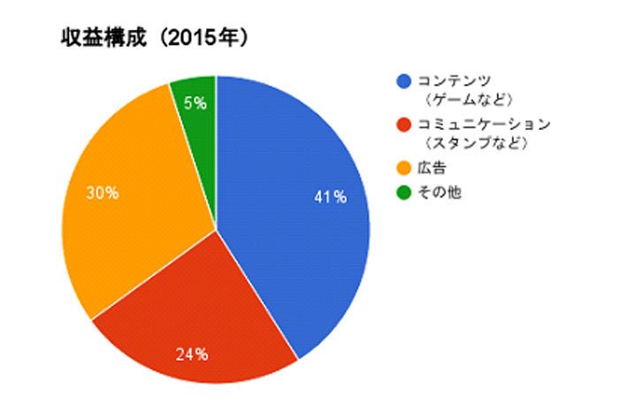 LINEの現在の収益構成は、コンテンツ41%、コミュニケーション24%、広告30%、その他5%となっています。「コンテンツ」はゲーム、「コミュニケーション」はスタンプが中心です。