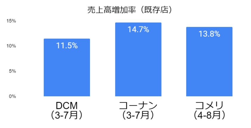 今回は、DCMホールディングス、コーナン商事、コメリという大手3社を取り上げました。DCMホールディングスが11.5%、コーナン商事が14.7%、コメリが13.8%と非常に大きな伸びを示しています。これに伴って利益の方も大きく上乗せされているという状況です。