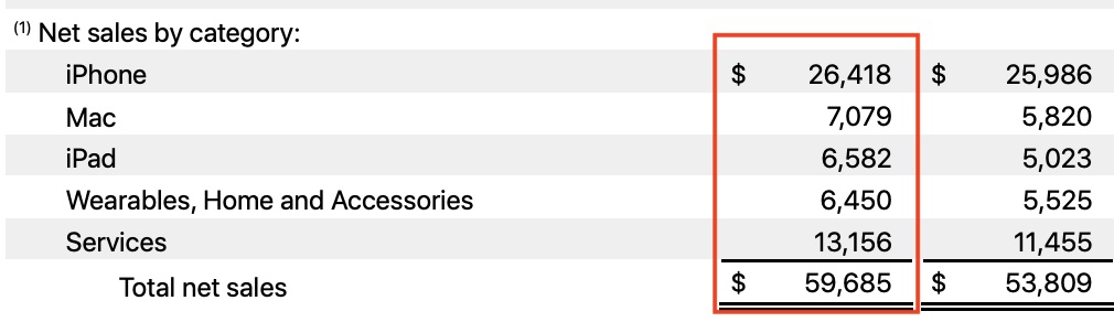 四半期の売上高は前年同期比(YoY)+11%の$59.6B(約5.96兆円)、売上の内訳としてはプロダクト売上がYoY+約10%で$46.5B(約4.65兆円)、サービス売上はYoY+14.8%で$11.5B(約1.15兆円)となりました。