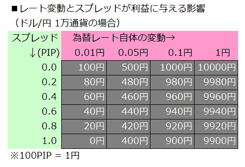 さて、スプレッドによってどれだけ利益にインパクトがあるかを表にしてみます。