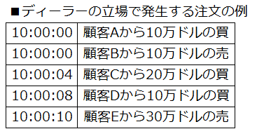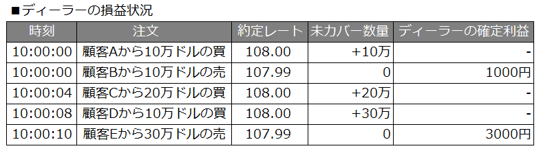 この例では、同一の時刻「10:00:00」に別々の顧客から反対向きの注文を2つ受けたので、スプレッドの分だけが丸ごとディーラーの利益になります。ここは重要なポイントです。