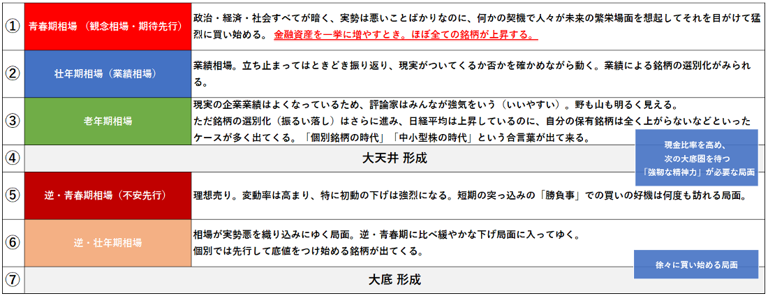しかし、それは青春期相場の終焉であるから、その幕間は「踊り場」「中間反落」であり、「大相場の終焉」ではない。次の3年先の業績を見ながら現実の業績を見て、それを確認しながら買うという壮年期相場が始まる。