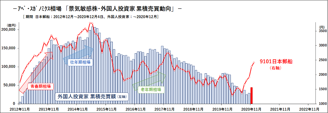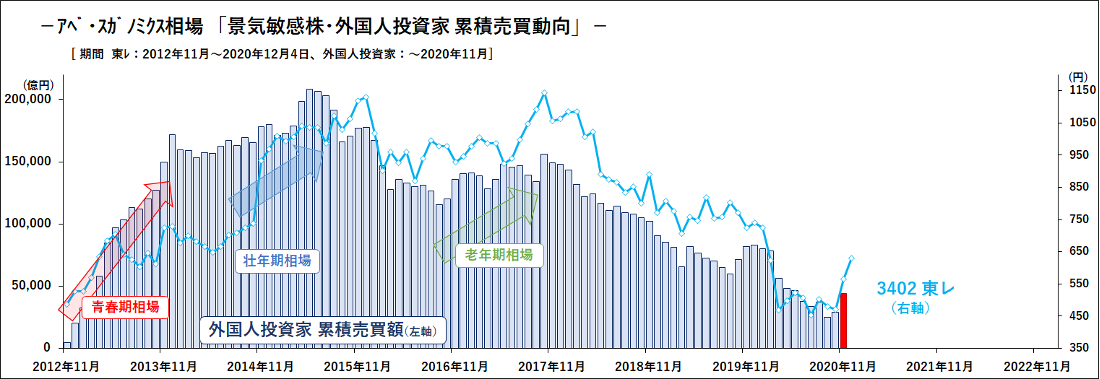 【国内景気敏感株・外国人投資家累積売買動向 2012年11月〜2020年11月】
