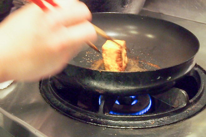 「焼き目がついたら一口サイズに切って、わさび醤油を添えて出来上がりです。」