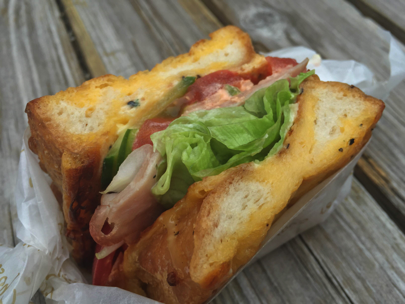 ふかふかのパンが我輩を包み、そのあとから来るトマトやハムの旨さ。