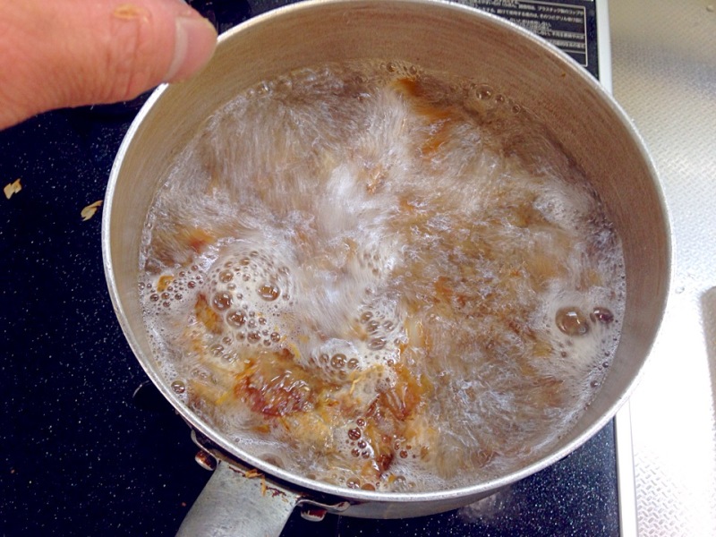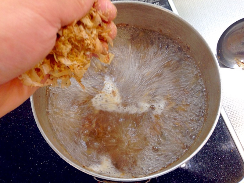 (普通かつお節を入れたら速攻火を止めますが、混合かつお節の場合はグラグラ焚いて煮出す方法を用います。この方法で無いと旨味、出しが出ません)