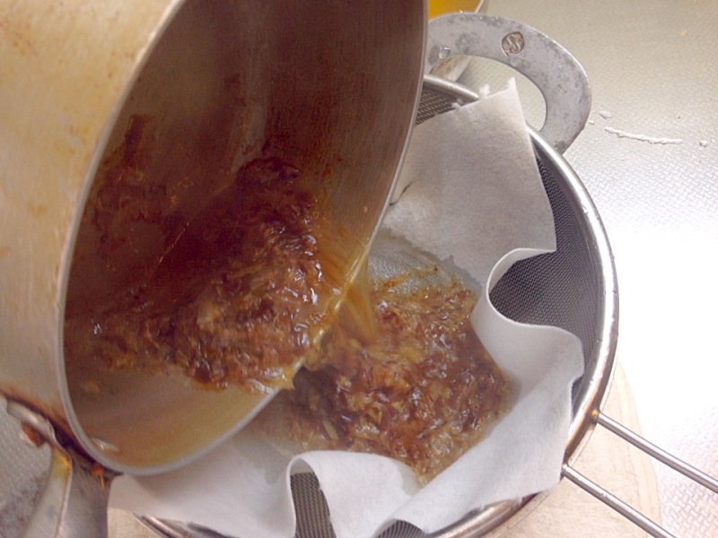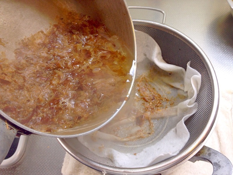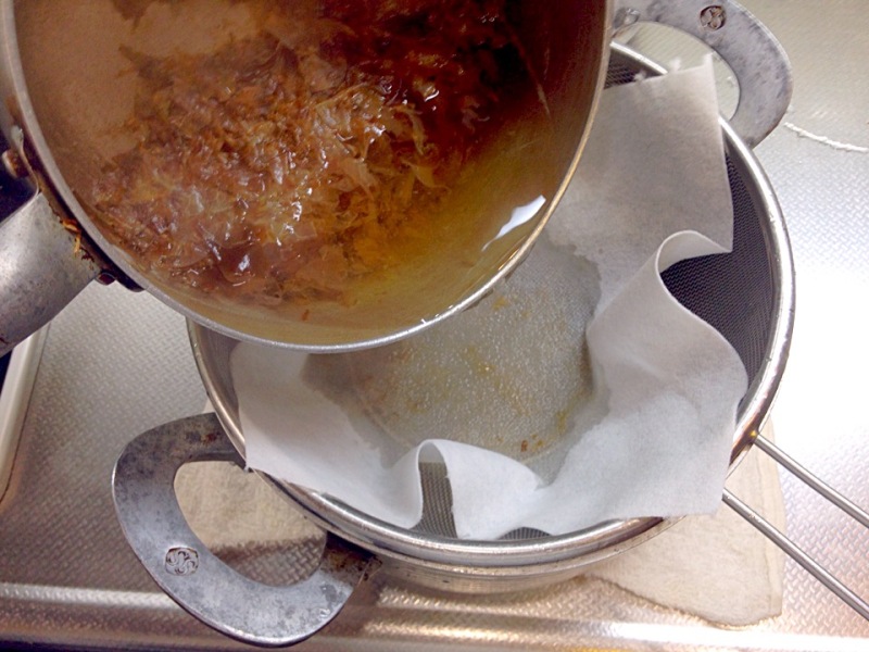 チョロチョロ入れ、最後バサッとかつお節も流し出し、濾します。