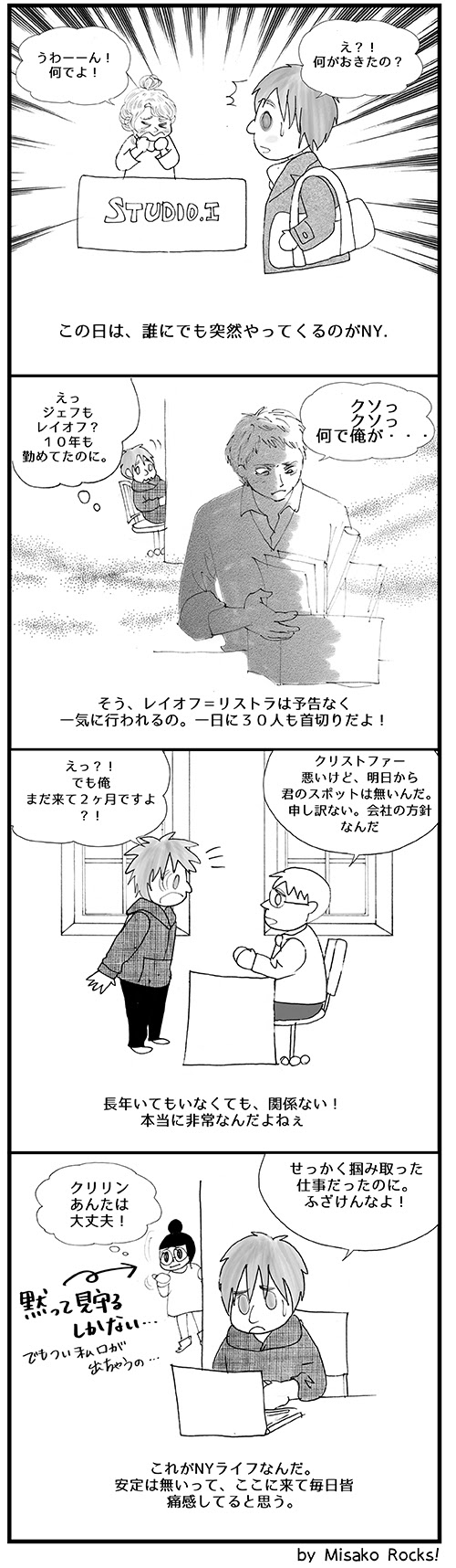 16年前、単身アメリカに渡り全米漫画家デビューを果たしたミサコロックスさん。現在NY在住の彼女のメルマガ『ミサコロックスの輝くLIFEのススメfrom NY!』には、会社勤めのニューヨーカー達の厳しい現実が描かれています。