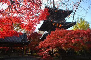 善峯寺(よしみねでら)京都市西京区の西山に位置し山の中腹に広大な境内を持つ古刹です。境内である山全体が真っ赤に染まる景観は圧巻です。高台にあり眺望もいいので、京都市内の大パノラマと紅葉が重なり合う景色は一見の価値アリです。江戸時代には徳川5代将軍綱吉(つなよし)の生母・桂昌院(けいしょういん)によって現存する多くの建物が復興されました。桜、あじさい、紅葉など季節によって色とりどり色彩を放ち一年中多くの観光客で賑わっています。多宝塔前にある、樹齢600年以上の五葉松は「遊龍の松」と呼ばれ、国の天然記念物として指定されています。スケールが大きく見どころも多いのでゆっくり時間をかけてハイキング気分で拝観したい紅葉スポットです。