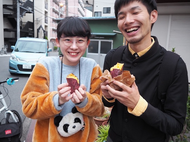 「値段は100グラムで200円の量り売りです。だから一本500円から700円というところでしょうか。いい芋を使っているので薄利多売です。安すぎる? でも大阪では、こんくらいの値段やないと売れないんです。東京でも同じ値段か? イベントにもよりますが東京でも基本は変わらないです。ただ高速を使って東京へ行っているので、一日40本は売らないと赤字になります。それでは商売にならない? う~ん。考え方ですよね。普通、作品を展示するときはギャラリーを借りてお金を払うでしょう。でも僕らは街なかで展示ができて、たくさんの人に見てもらえて、焼き芋っていう作品を買ってもらえる。ほかのアーティストにくらべて恵まれているともいえますしね」