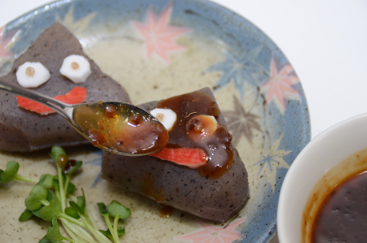 4.お皿にこんにゃくを取り出し、別で作ったの顔パーツを乗せます。小鉢に作ったタレを入れて添えたら完成です。タレはお好みの量をかけてお召し上がりください♪