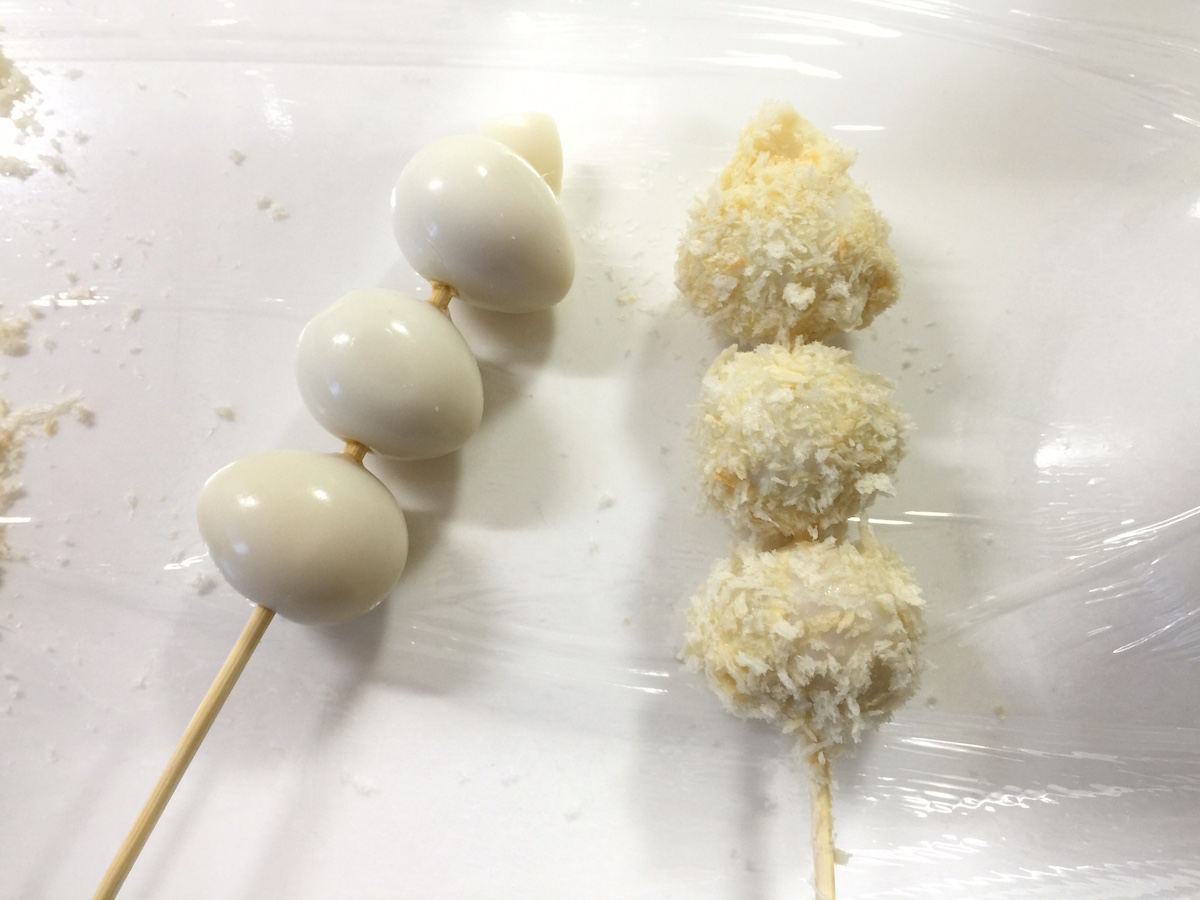 1.うずらの卵を竹串に3つずつ刺します。余りの1個でスライムのツノ部分をカットして作り、一番上に刺します。