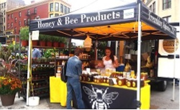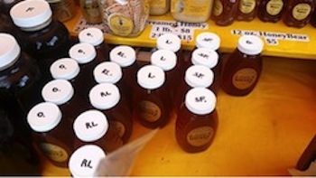 Honey And Bee Productsは、ニューヨーク郊外から参加している蜂蜜屋さん。まずこの蜂蜜の種類を見て! 花の種類によってこんなにもたくさんのフレーバーがあるんだ。