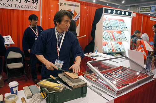 また、大阪府堺市に本拠を置き、600年の歴史を誇る境刃物を扱う「青木刃物製作所」では、最高品質の包丁を展示し多くの関係者の興味をひいた。