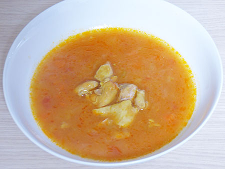 さっそく温めて見ましたが、まるでスープカレーのよう。パンに絡みやすそうですね。鶏肉と人参、玉ねぎ、セロリが入っています。