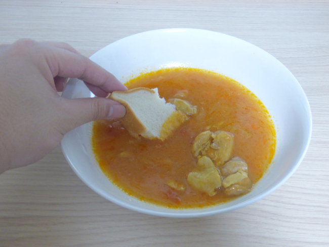 パンにつけて食べてみましたが、チキンベースでトマトなど野菜の旨味が口の中で広がり、程よくスパイスが最後にピリッと効いていて、とってもおいしかったです。