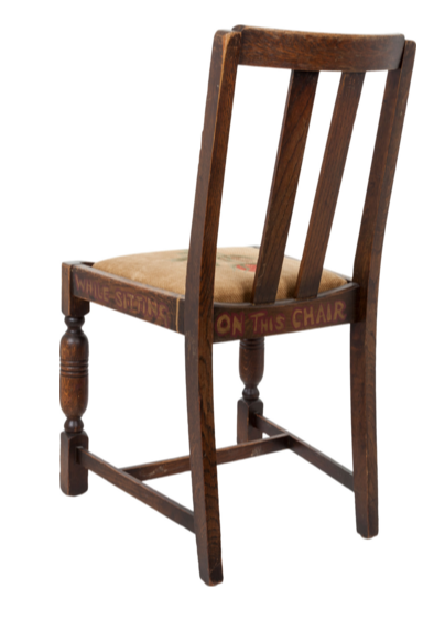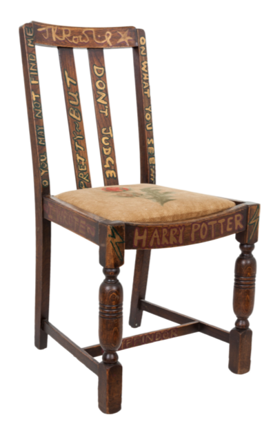 この椅子はシリーズの記念すべき1作目と2作目に使用されただけでなく、ローリング氏の手でデコレーションされており、ハリー・ポッターという文字が座部の正面に同氏の手書きで書き込まれている。椅子には「新しい椅子のオーナーへ」と題された同氏本人による直筆サイン入りメッセージも付属されている。