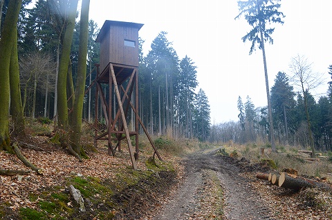 落ち葉が一杯の道を1人歩いて行く。やがてまた針葉樹になり、その外れには野鳥観察の見物台であろうか、1平方メートルくらいの屋根付きの小さな建物があった。道に迷った時、こんなものが目印になる。よく観察し、写真にも収めた。
