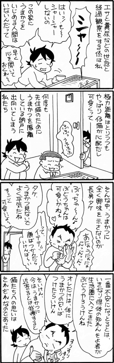 飲食店の店先で見かけたノラの子猫を拾ってきたという漫画家の大原由軌子さん一家。しかし「うまかつ」という一風変わった名前をつけられたその子は先住猫には喉を鳴らすものの、大原家の人々にはまったく心を許さず…。メルマガ『大原さんちの九州ダイナミック』に、一家4人それぞれの「猫たちとの接し方」が描かれています。