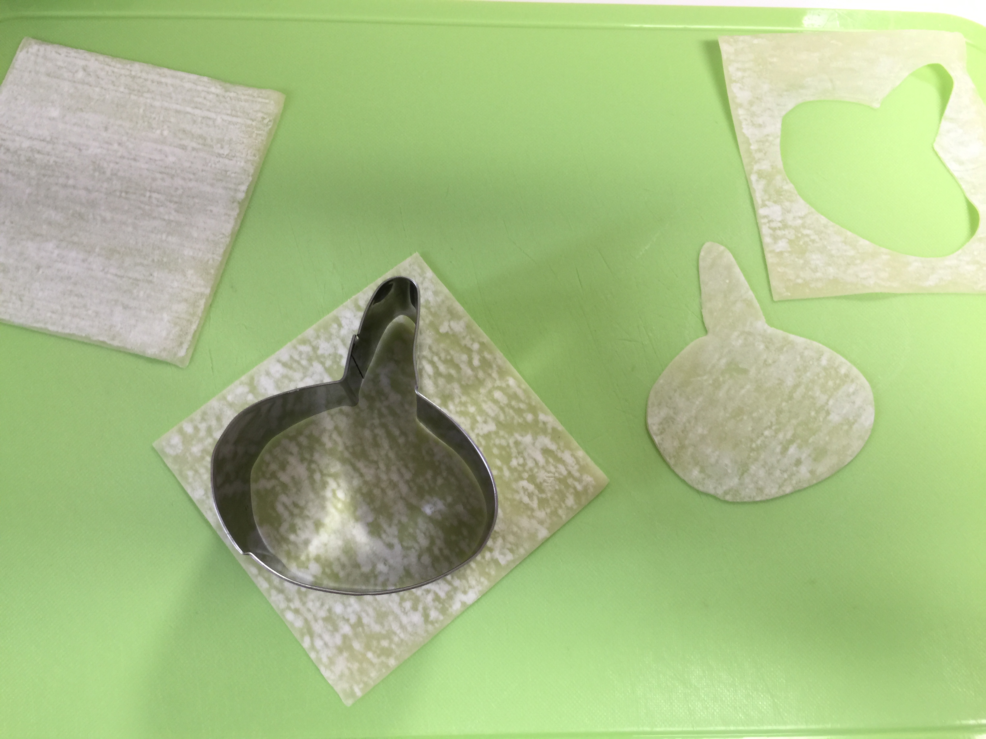2.ワンタンの皮は、スライム型を利用してくり抜いておきます。スライム型は市販のクッキー型を曲げた自作品です。