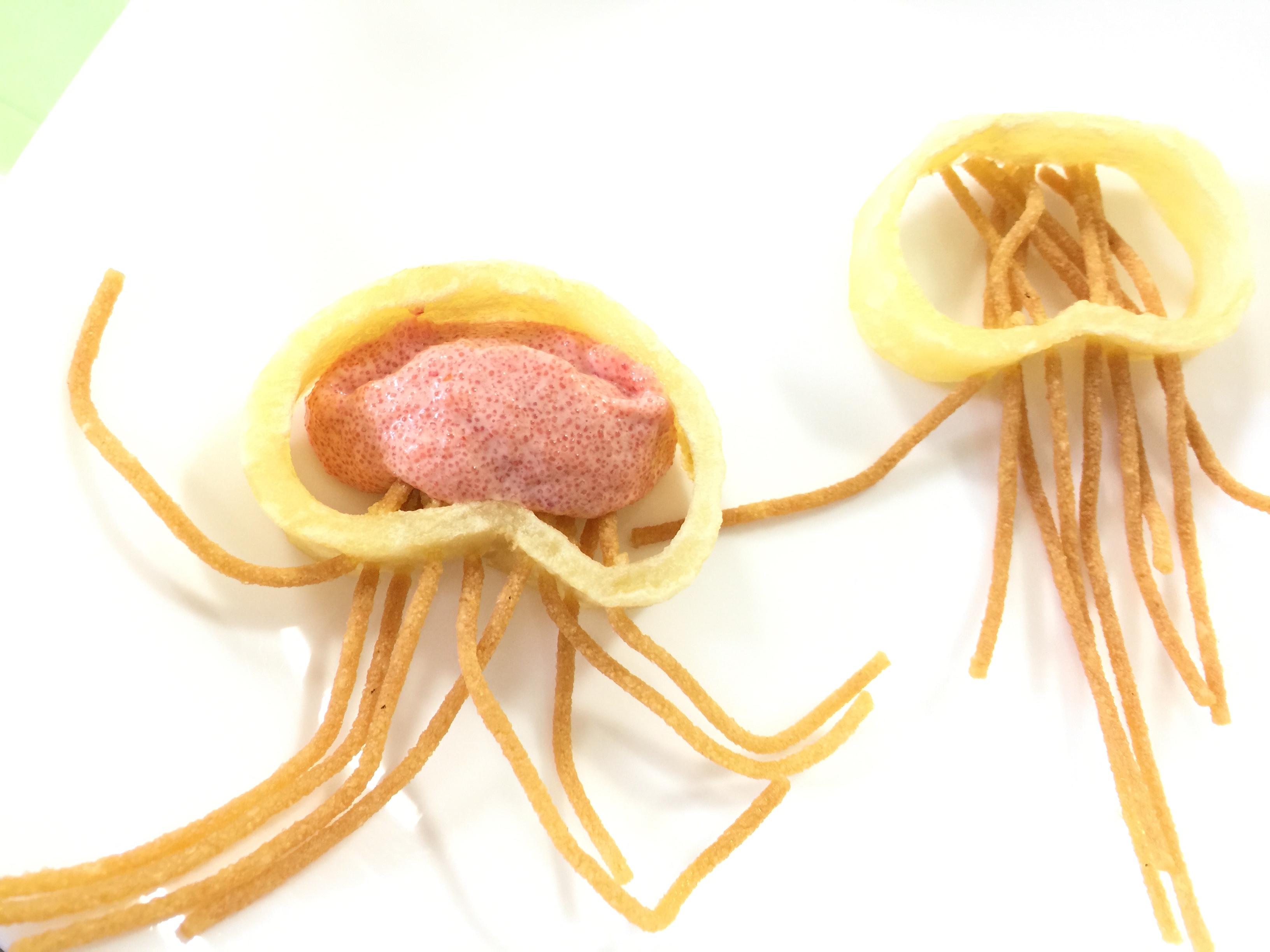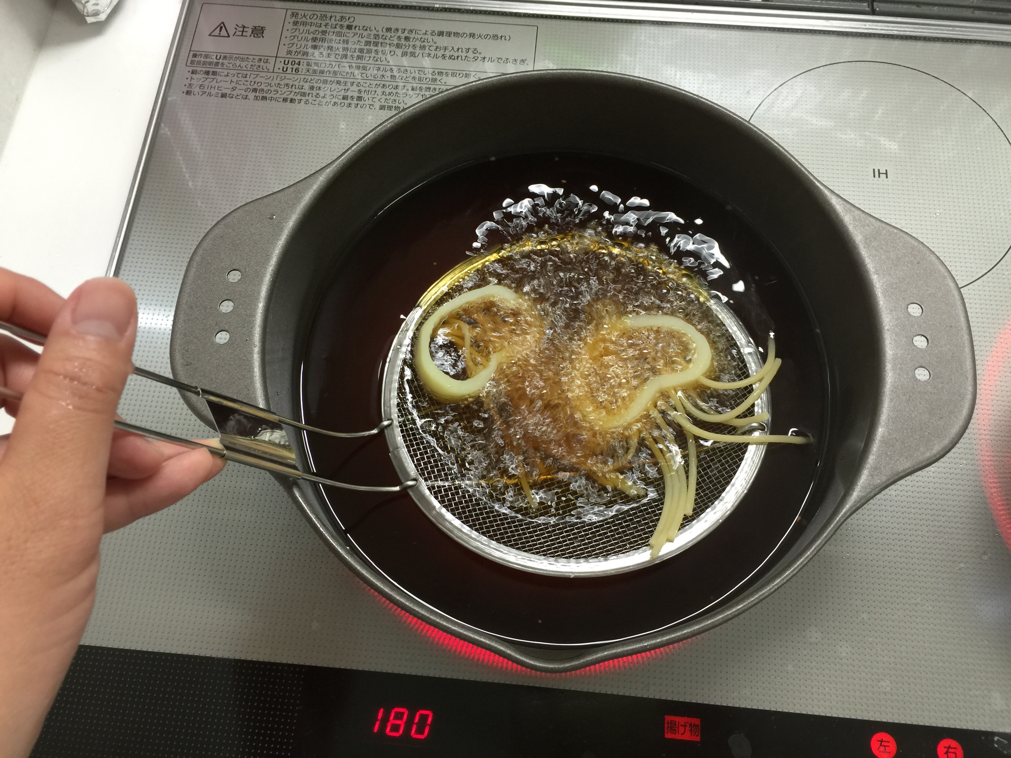 5.茹で上がったら軽く水気を取り、平ザルに載せたまま180度に熱した油で揚げます。触手っぽい感じになるように、油に投下する前にパスタに動きを付けましょう。