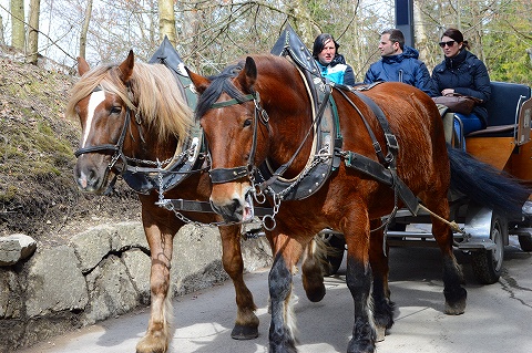 このノイシュヴァンシュタイン城に行く方法は3つある。馬車で行くか、シャトルバスを使うか、歩くかである。ただ、3月の今の時期はシャトルバスは運休中である。また、馬車も3台と、台数はそれほど多くはない。今の時期は、ほとんどの人は歩くしかないのが実情である。