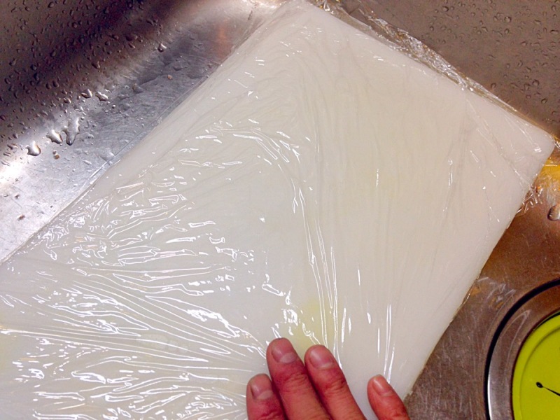 晩めしが出来上がったら、食べる前にまな板を漂白し、ラップをかけます。