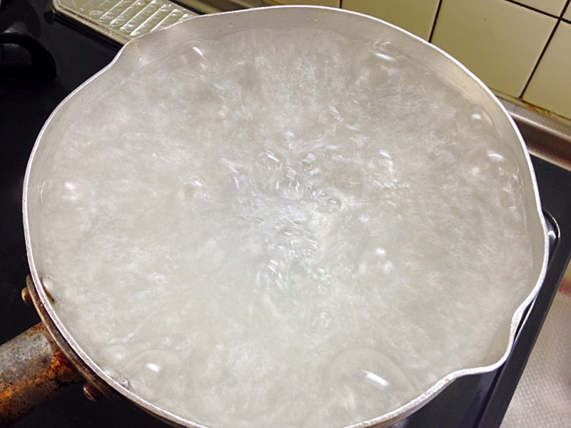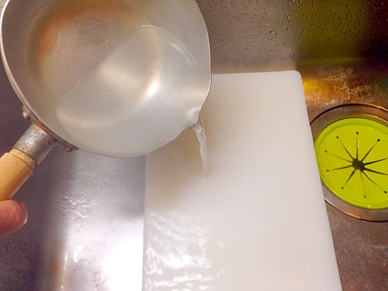 6.その後、グラグラ完全に沸騰した湯をまな板にかけます。