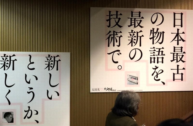 高畑勲さんが脚本・監督した「かぐやの物語」のPR広告です。特命コピーライター太田光さんが書き下ろしたコピーライティングのパネルです。