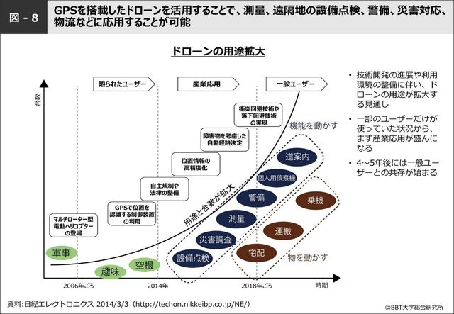 今でこそマニアのような一部のユーザーが趣味で使用するケースが多いですが、数年以内には設備点検、災害調査など、産業にも広く応用されていくことでしょう(図-8)。