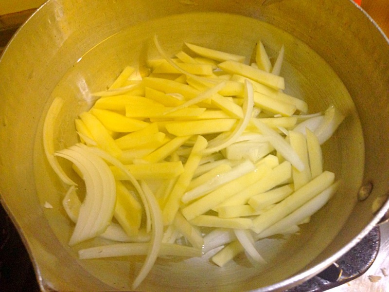 6.鍋に水500ccを入れ、じゃが芋と玉ねぎを入れ、強火で沸かします。