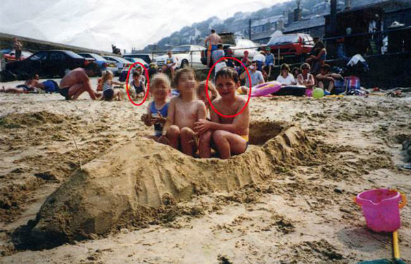 そこには、11年前にビーチで撮影された1枚写真があったのですが、ニックさんの家族の背後にいるのが、なんとエイミーさん家族だったのです。