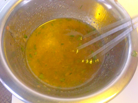 ボウルに熱めの湯10ccを入れ、カツオ出しの素1gも入れ、混ぜて溶けたら、冷凍庫で急冷します。(忘れて凍らないように、タイマーをかけてください)