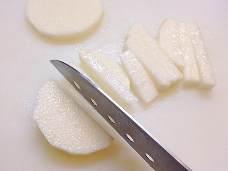 6.使う分だけ切り落とし、それを3等分の輪切りにします。