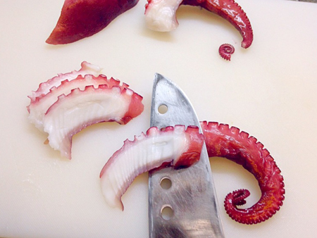次にタコを切ります、頭(ほんとは”体”)と足を切り離します。足の太い部分から、切り始めます。包丁を寝かし、刃元からクネクネさせながら5mm厚で削ぎ切りにします。