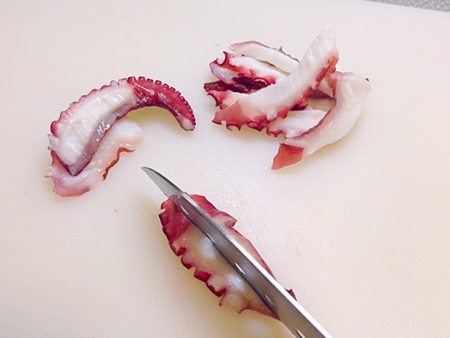 8.削ぎ切りにしたタコを縦半分に切ります。