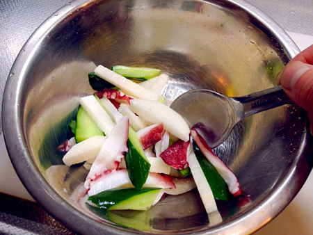 9.ボウルに胡瓜、長芋、タコを入れ、やさしく混ぜます。