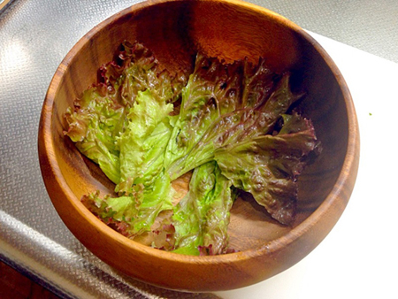 10.器の底に、流水で洗って水気をきって約7~8cm角にちぎったサニーレタスを敷きます。