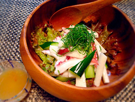 これは、長芋、タコ、胡瓜を食べ易く切って、ザックリ混ぜてさっぱりの梅のドレッシングをぶっかけるだけの簡単なサラダです。長芋、胡瓜の歯ごたえが良く、食感が楽しめ、タコも特殊な切り方で切ってるので、かみ易くなってます。ほどよい甘みで酸味のバランスのよい「梅肉ドレッシング」で、タコ、独特の臭みもほぼ感じません。酒のアテになる「サラダ」です。