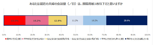 まず、一日の夫婦の会話量について聞いてみたところ、44.0%と約半数の人が一日の夫婦の会話量が「原稿用紙1枚以下」だと思っているという実態が明らかになりました。400文字分も一日に会話していないとなると、そうした日々の積み重ねが互いに感じていることにすれ違いが生じてしまったり、パートナーに対し一方的にイライラしてしまうことに繋がるのかもしれません。