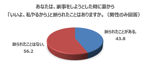 次に、男性のみへの質問として、家事をしようとしたときに妻に断られた経験があるか聞いてみると、断られたことのある男性は43.8%という結果に。そこで、男性の本音を聞いてみたところ「やってくれてありがとう! ラッキー! って感じました」(47歳・男性)や「殊勝だなと思う。どうやら今日は楽をしてもいいようだ」(35歳・男性)のようにポジティブに捉える男性もいる一方で、「なんとなく寂しかったが、嫁さんが気を遣ってくれていると思うと悪いことをしたと思った」(47歳・男性)と申し訳なく思ってしまう男性も。そして、やはり「せっかくやる気になったのに、どうして断るのかわからない」(47歳・男性)「自分のやり方があるだろうし、思ったとおりにならなくて二度手間になることもあるから言うのだろうが、もっと言い方があるだろうと思った」(48歳・男性)「折角やろうと思ったのに、気持ちが下がった」(49歳・男性)といった不満の声がかなり多いようでした。